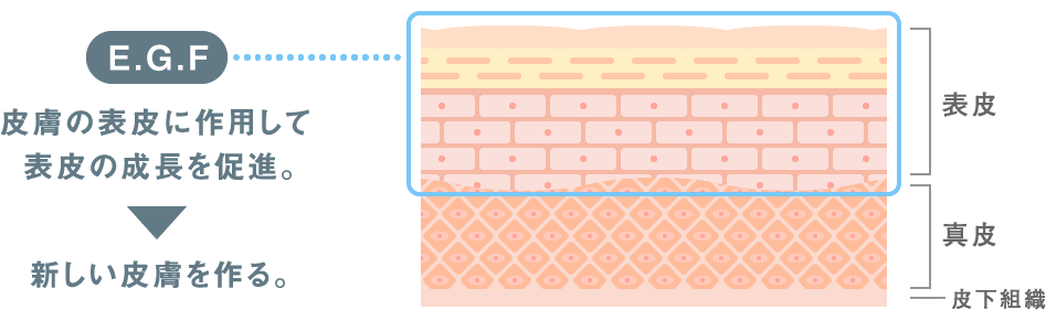 *:「E.G.F.(Epidermal Growth Factor)」とは、上皮増殖因子(或いは、表皮成長因子)と呼ばれ、肌のターンオーバーを早め、維持再生に貢献する物質です。